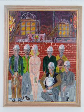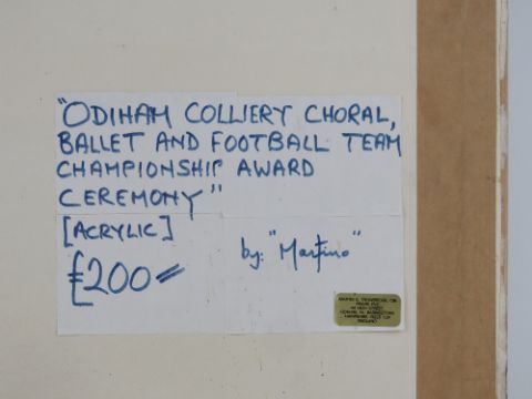 Acrylic by Martino entitled Odiham Colliery Choral Ballet and Football Team Championship Award Ceremony, having central female nude, 59 x 45cm, framed.