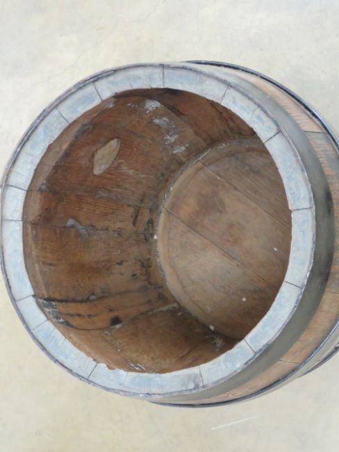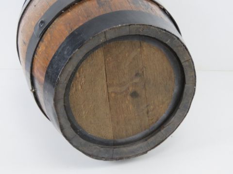 A coopered oak barrel standing 43cm high.
