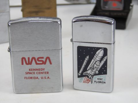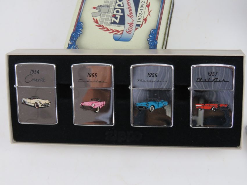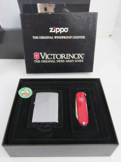 A quantity of Zippo and lighter collectables including; three Zippo manuals in Japanese, a Zippo Anniversary 1932-92 lighter in box, a Victorinox Zippo presentation set with Swiss Army knife, a Zippo Fabulous 50s presentation set and other lighters.