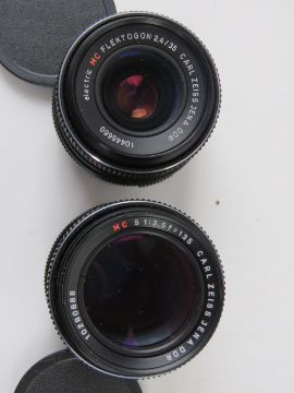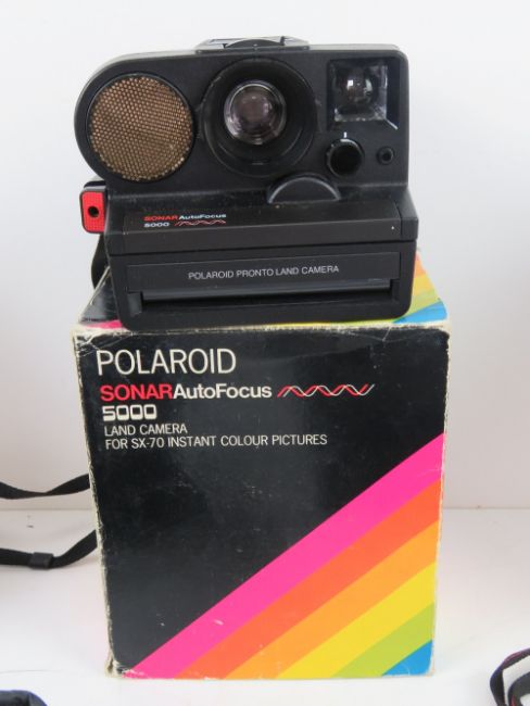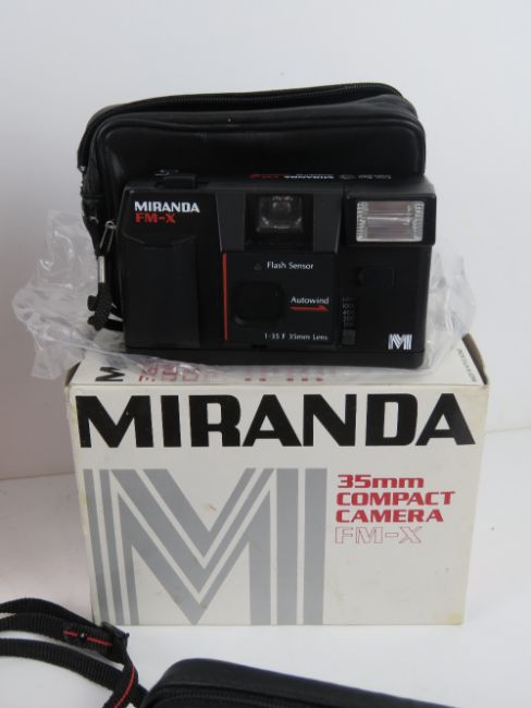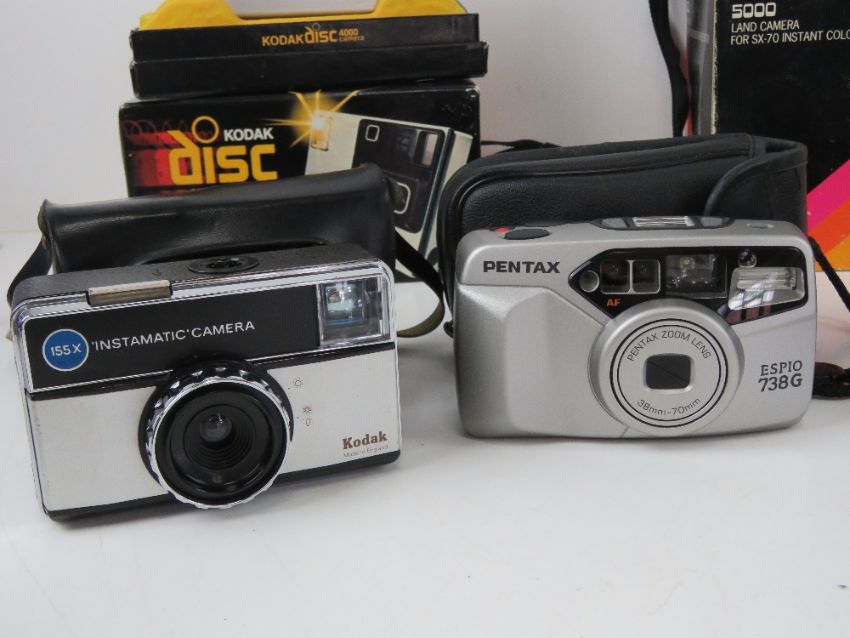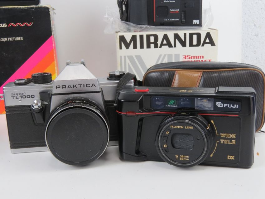 A quantity of vintage camera equipment inc two Carl Zeiss Gena DDR lenses, one being 2,4/35, the other S1:3,5f=135, Kodak Disc 4000 in original box, Polaroid Sonar Autofocus 5000 in original box, Miranda 35mm compact camera FN-X in original box, a Praktica Super TL1000, Yashica light meter, etc.