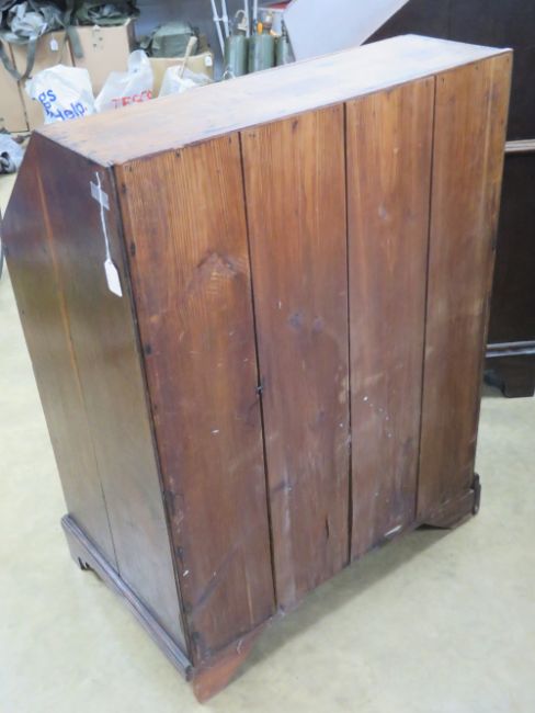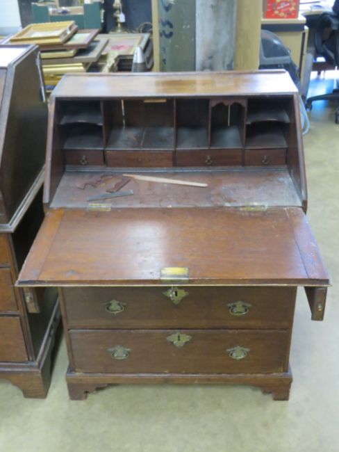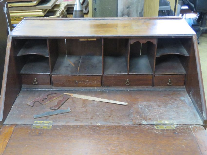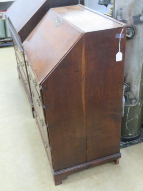 A good short late Georgian oak fall front bureau having two short over three long graduating drawers, brass drop handles and escutcheon plates throughout, opening to reveal various compartments and pigeon holes within, all raised over bracket feet, slightly a/f. 72 x 46 x 94.5cm.