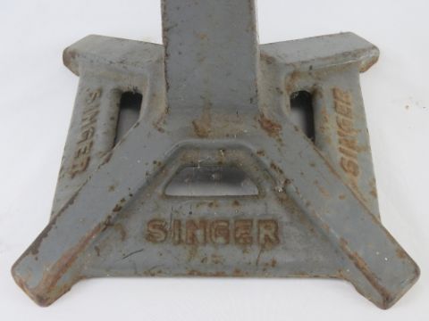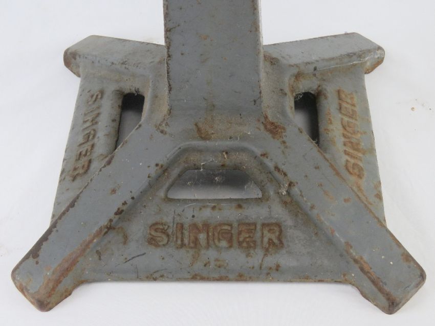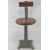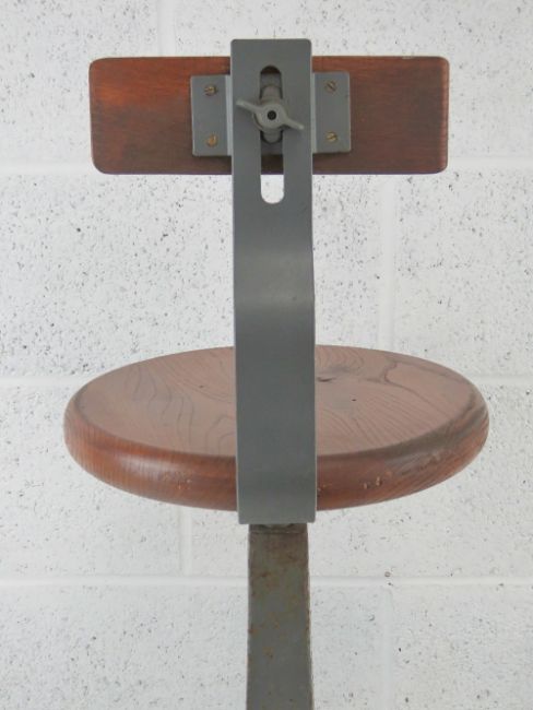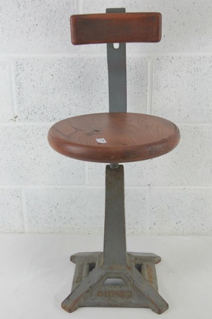 An elm top Singer (sewing machine) square shaped tapering stool with sprung back, seat 36cm dia, 80cm high, in unrestored condition.