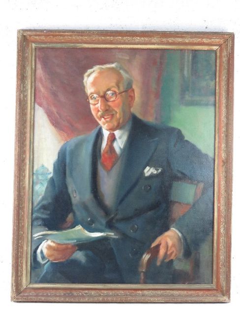 GHB (George) Holland (1901-1987), oil on canvas, half length portrait of Doffman with papers in hand, signed upper right, framed, sight size 69 x 90cm.