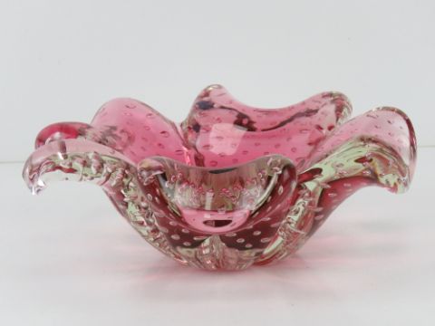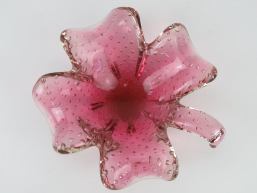 An art glass bowl in the form of a four leave clover, pink ground, having bubble pattern throughout. 24cm wide.