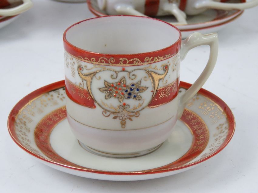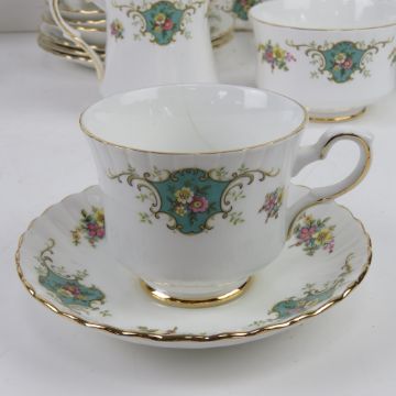 Two part tea services, one by Royal Stafford comprising cake plate, milk jug, sugar bowl and trios, the other in orange and cream ground.