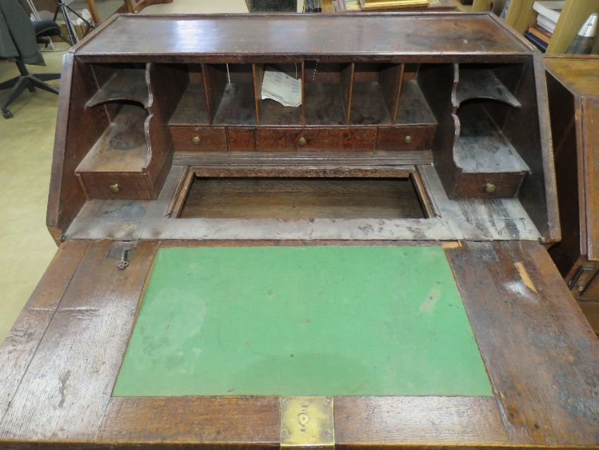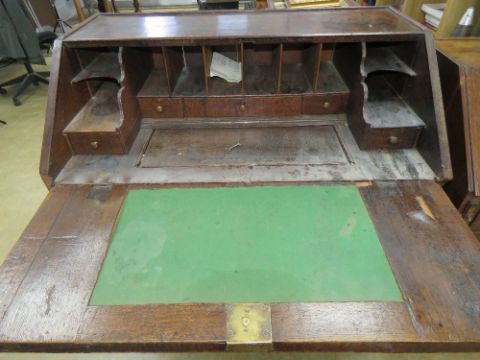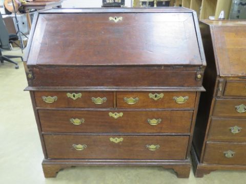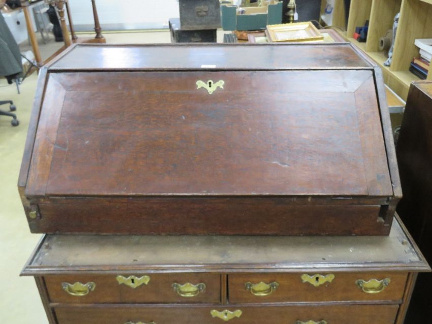 An early 19th cenmtury fall front campaign type (top/bottom sectioned) bureau having two short over two long drawers, lid opening to reveal green baize writing surface, slide compartment, drawers and pigeon holes, raised over two short over two long drawers, all on bracket feet having brass drop handles and escutcheon plates throughout. 96 x 55 x 102cm.