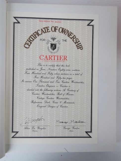 Book; Cartier a Century of Cartier Wristwatches, together with certificate of ownership No 08661 dated June 1989. 450 colour photos over 550 pages.