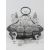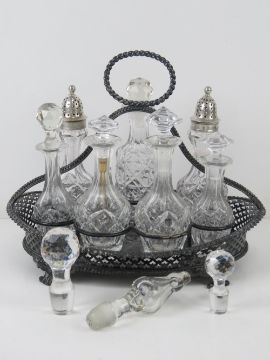 A large silver plated and cut glass cruet set having two cut glass sugar castors with HM silver tops and five assorted oil and vinegar bottles, 27cm wide.