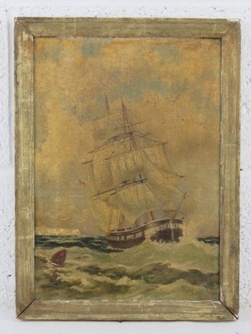 Unknown artist, oil on canvas, maritime painting of a masted sailing ship in stormy waters, sea before, land and sky beyond etc, framed, sight size 24 x 34cm.