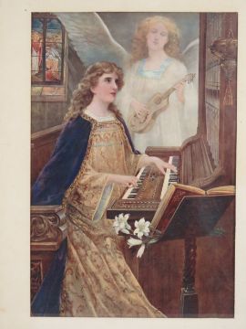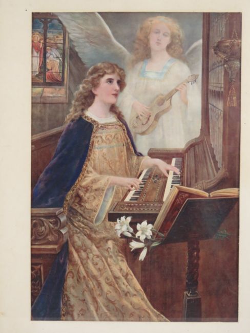 Two ecclesiastical prints; one being medieval female playing the organ with angel beyond, 50 x 34cm, framed and mounted, the other entitled 'Holy Work and Loving Hands', 34 x 30cm oval, in frame.