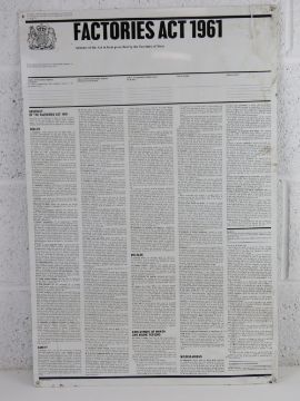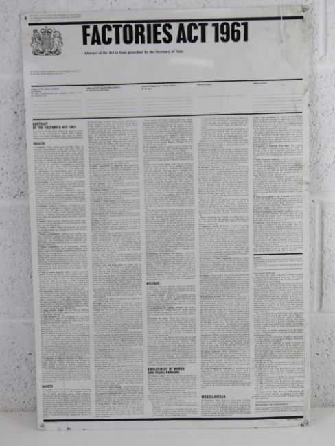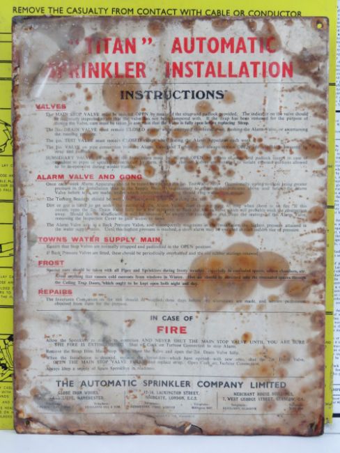A quantity of industrial statuary metal wall notices including 'Factories Act 1961' 75 x 50cm, 'Electric Shock Act at Once' 50 x 35cm, and 'Titan Automatic Sprinkler Instillation' 40 x 30cm.