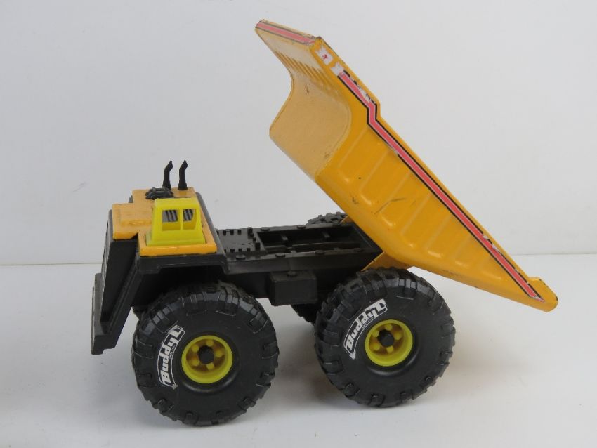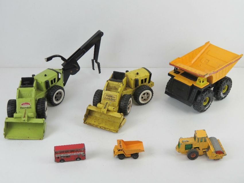 Three Tonka toys being dumper truck, loader and trencher. Together with some other model toy vehicles.