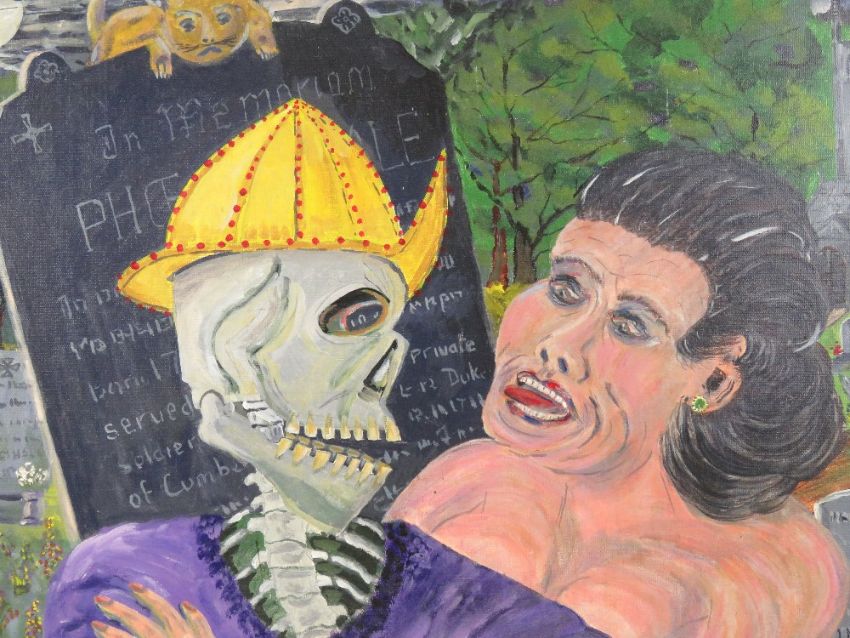 Abstract acrylic by Martino titled 'A Village in Wooing' featuring a woman and skeleton in embrace with graveyard beyond 59 x 45cm, framed.