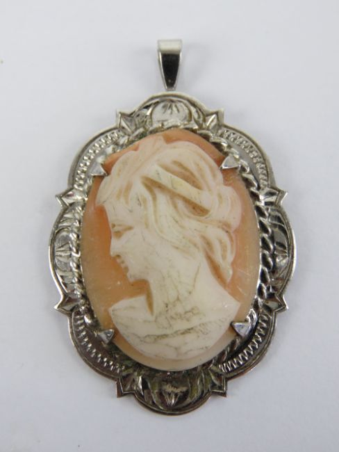A HM silver pendant having carved shell female cameo portrait upon, 4cm inc bale.