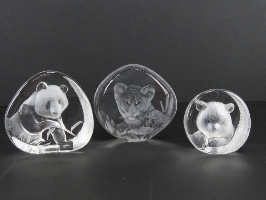 Mats Jonasson Swedish lead crystal paperweights; Leopard Cub 13 x 12cm, Panda 13 x 12cm, and Bear Cub 9.5 x 9.5cm. Three items.