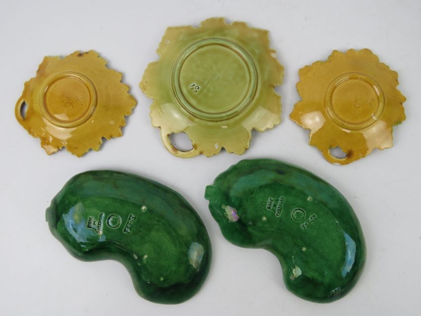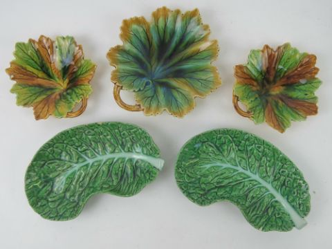 Three Victorian majolica ware leaf dishes, together with a pair of cabbage ware plates. a/f.