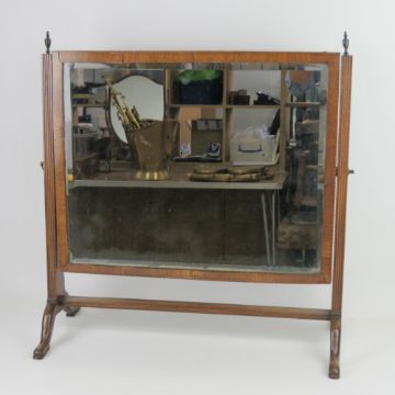 A bevelled edge Edwardian toilet mirror raised upon reeded supports terminating in outswept legs, brass finials, 59 x 62cm, slightly a/f.