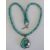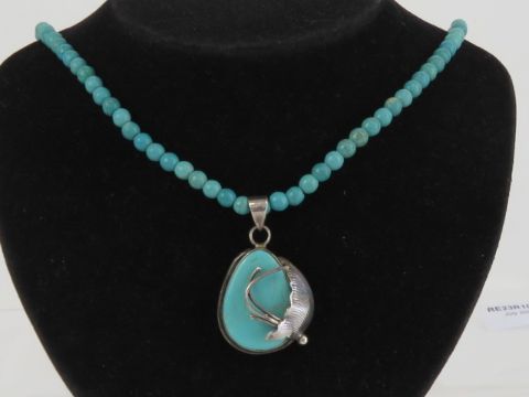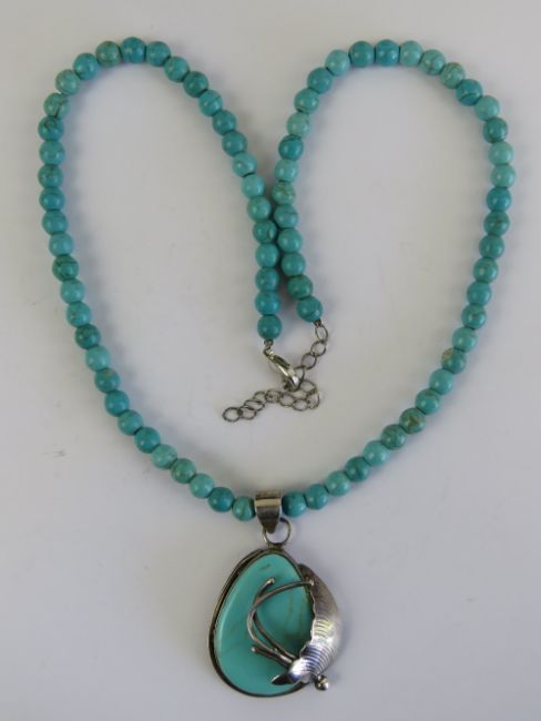 A floral silver and turquoise pendant, having large teardrop cabachon in frame stamped 925 approx 4.8cm in length, on beaded necklace, clasp unmarked.