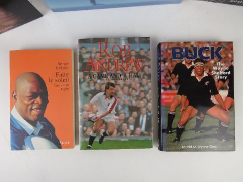 Books of rugby interest. Buck the Wayne Shelford story, Rob Andrew a game and a half, the Austin Healey story. Six items.