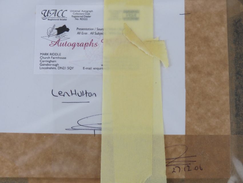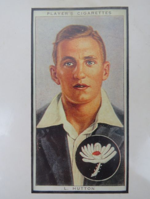 A enlarged Players Cigarette card featuring the cricketer Len Hutton with inset signature under.