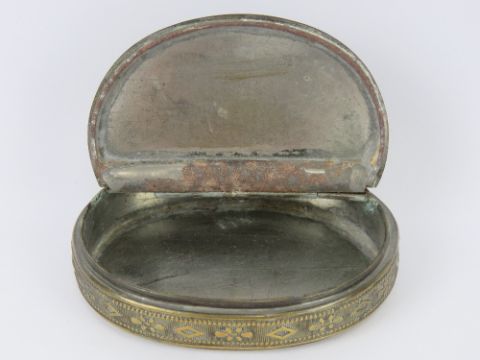 A brass snuff box of oval form with hinged lid, 8cm wide. Together with a cigar cutter. Two items.