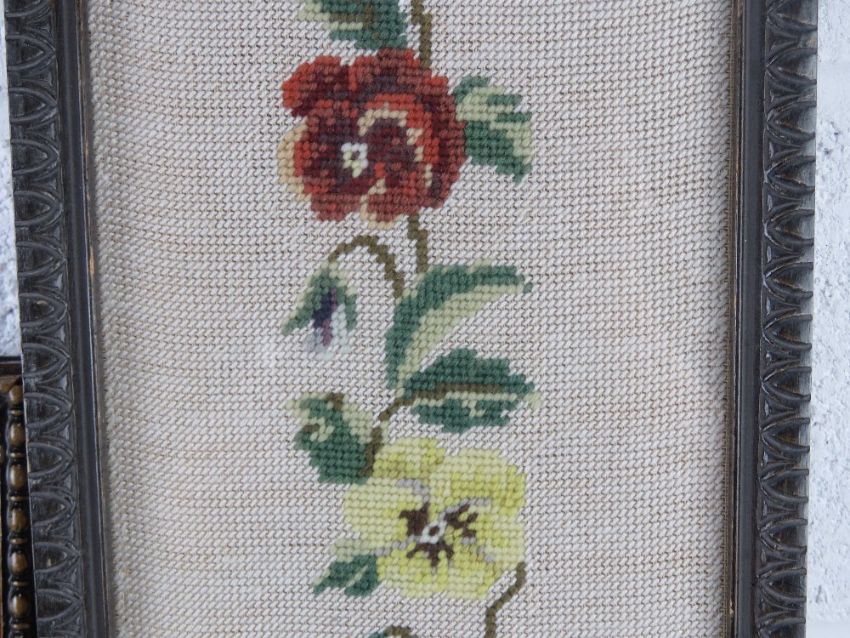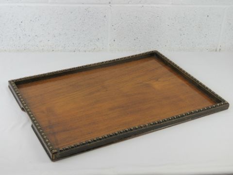 A good oak tray c1930s, measuring 58 x 41cm together with a glazed needle point panel, framed and complete with end handles, measuring 93 x 23cm.