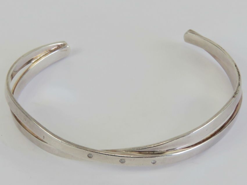 A HM silver bangle having crossover design set with three white stones, hallmarked for London, 17.2g.