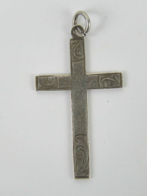A silver crucifix pendant having scrolling engraving to front, stamped sterling, 3.5cm in length inc bale.