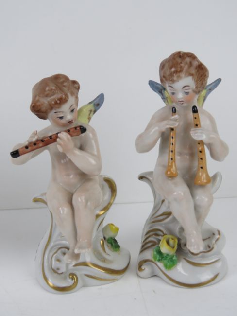 A set of five ceramic angelic musicians, Continental, each approx 12cm high, each with 'N' with crown over to base.