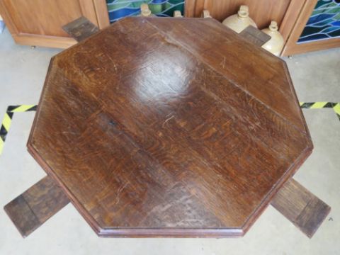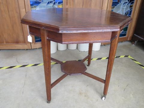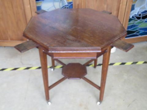An octagonal oak planter table, square legs tapering to terminate in ceramic castors, united by under shelf, having narrow pull-out slides to four sides. Measuring 82cm wide.