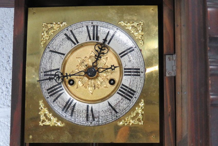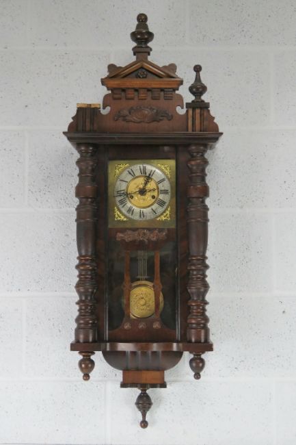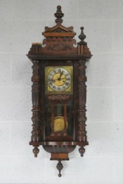 An early 20thC Vienna wall clock having eight-day striking movement and all measuring approx 98cm high, marked G.Hicks Northampton to the dial, with key and pendulum.