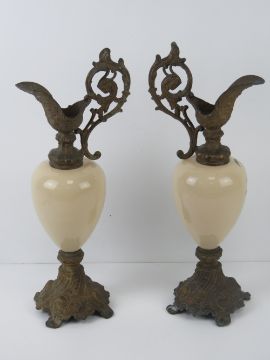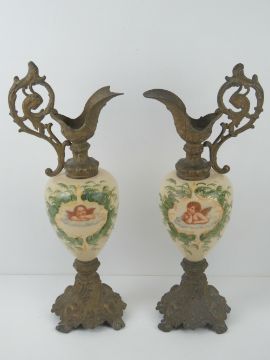 A pair of decorative ceramic 'ewers' having transfer printed cherubs upon and further hand painted decoration, one a/f, each standing 41.5cm high.