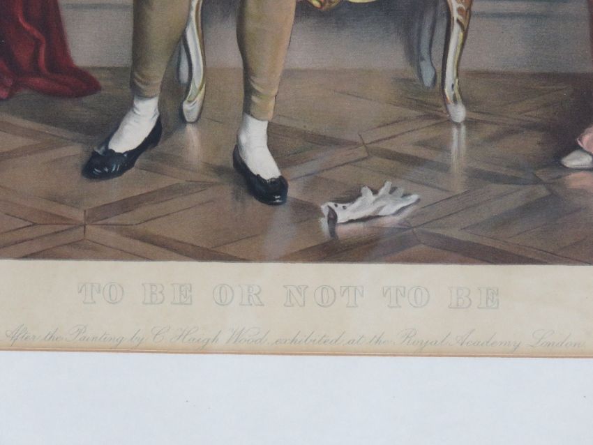 A good pair of coloured prints entitled 'To be or not to be' and 'Two screens to her bow' from paintings by C Haigh Wood, as exhibited at the Royal Acadamy. 42 x 57cm, framed and mounted.