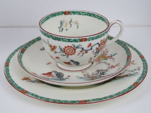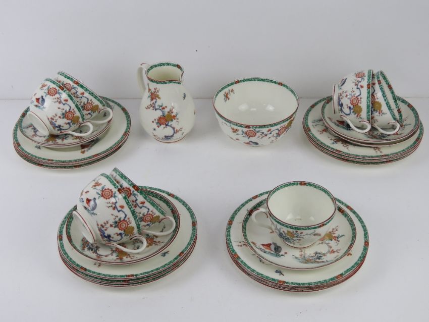A quantity of reproduction early Worcester tea ware in the Old Bow pattern (originally c1768) comprising six trios plus spares, milk jug and sugar bowl.