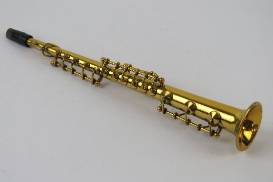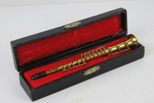 A miniature brass clarinet in case, approx 16cm in length.