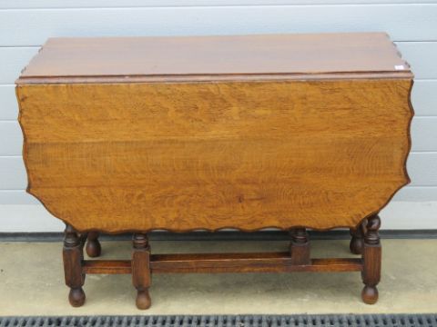 A substantial oak drop leaf table having unusual shaped top over barley twist base with gate legs 107 x 140cm extended.