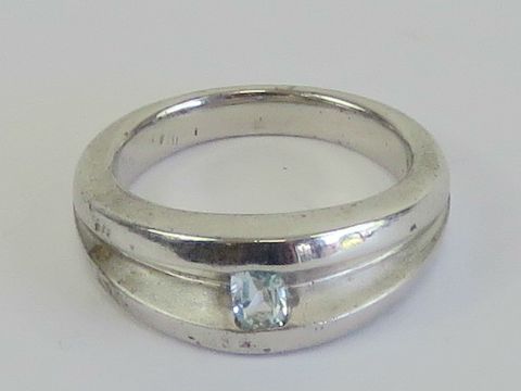 A HM silver ring having central aquamarine to the wide two sectional band, hallmarked for Sheffield, size O, 8.4g.