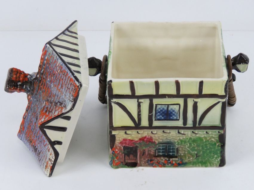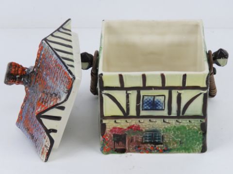 A hand painted ceramic wafer / biscuit barrel in the form of a beamed house 'Ye Olde Inne'.