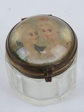 A Venetian hand painted glass bud vase, 15cm high, together with a carved bone scent bottle, 7cm high, a miniature green glass bottle having portrait and indistinct writing to front and a rouge pot. Four items.