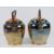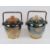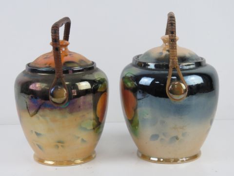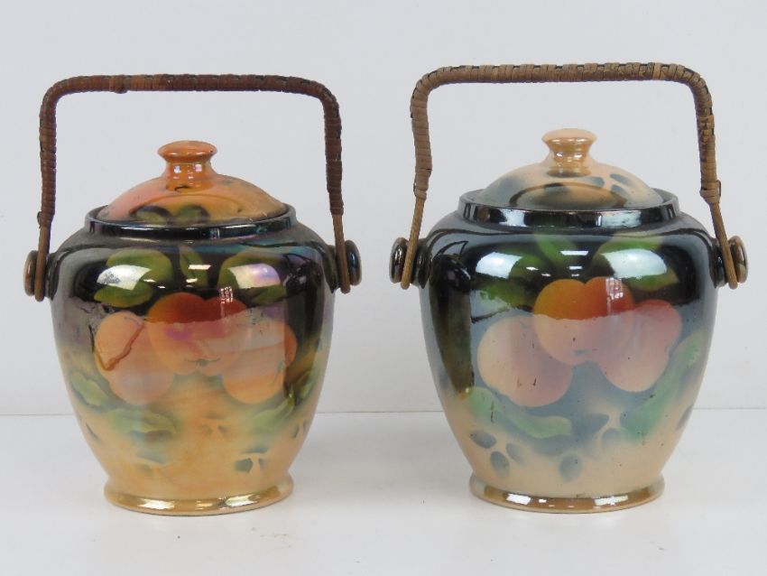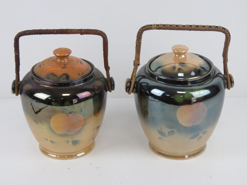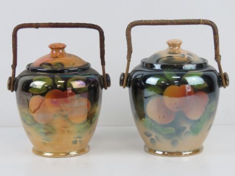 Two ceramic pearlescent wafer / biscuit barrels each with wicker handle and fruit design upon.