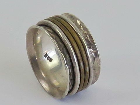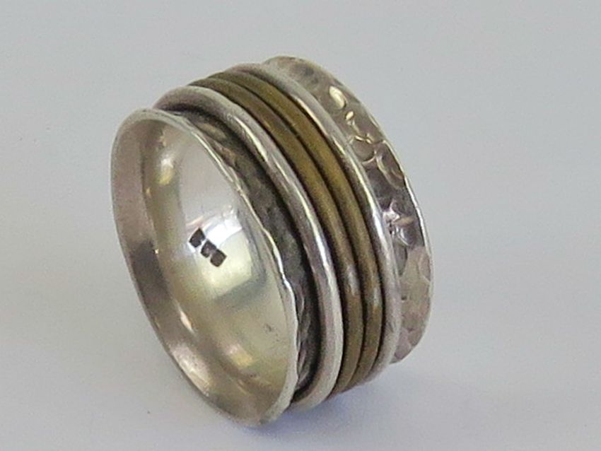 A handmade worry ring (stress ring / fidget ring) having four rotating central bands, stamped 925, size R.