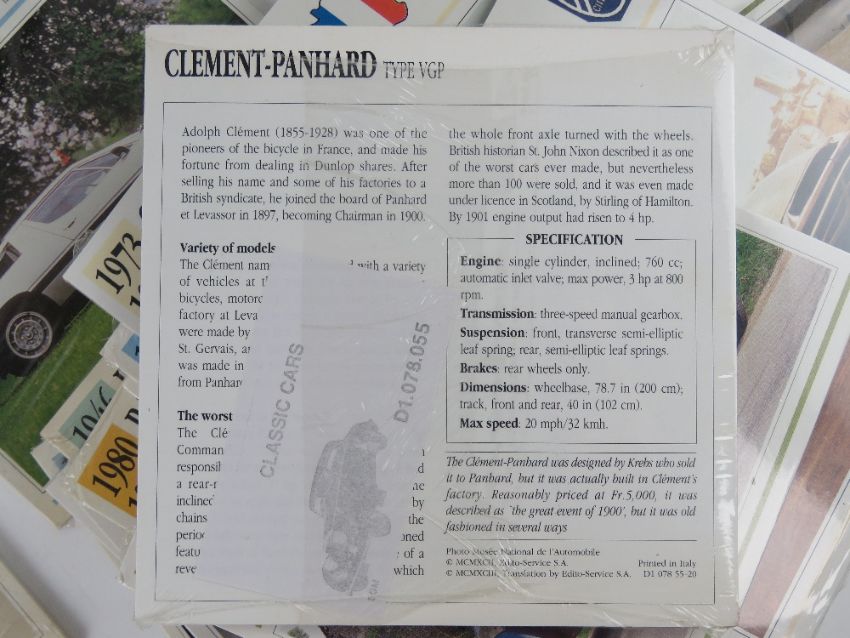 A boxed set of Classic Cars Collectors Club information cards comprising various manufacturers, marques, years and drivers.