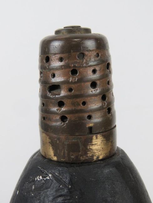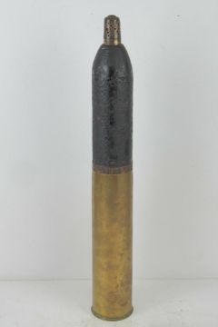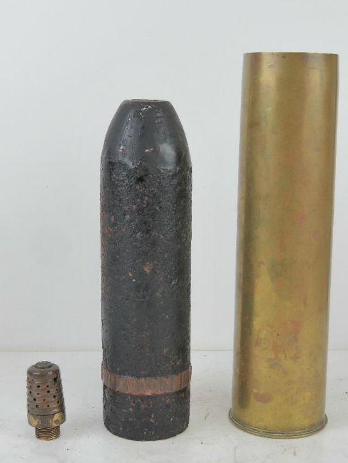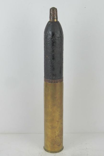 An inert WWI French 75mm shrapnel shell, indistinct date, marked L344 14 P to the shell. Standing 60cm high.