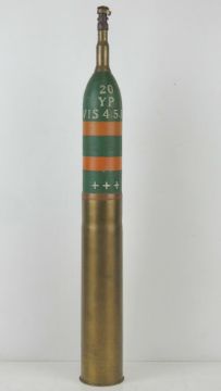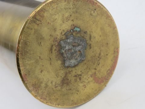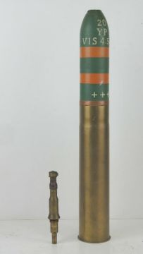 An inert WWI French 75x 370mm gas shell, with a HE long fuse, original paint and dated 1918. All standing 71cm high.