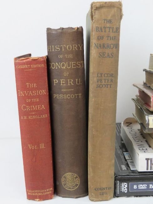 A quantity of assorted military themed books and DVDs inc: DVDs of World War II, 'Benito Mussolini', 'The Great Siege', 'The Defeat of the Spanish Armada', etc, fifteen items.