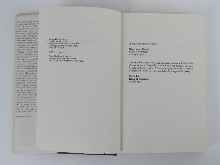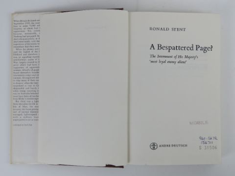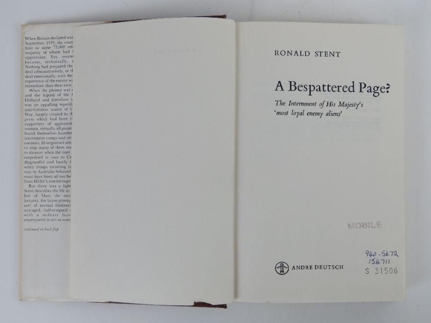Book; 'A Bespattered Page? The Internment of His Magesty's Most Loyal Enemy Aliens' by Ronald Stent. Published 1980 by Andre Deutsch. Some bleaching to spine of dust cover.