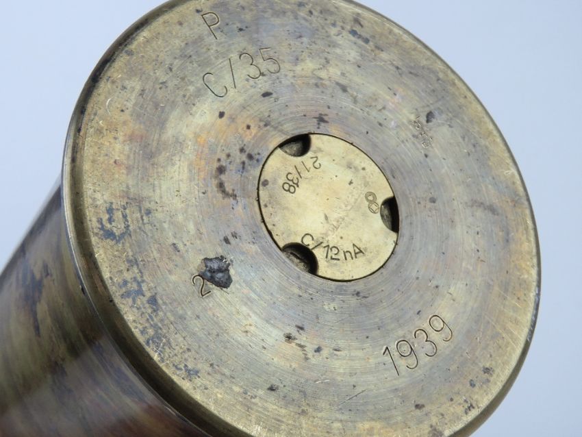 An inert WWII German U-Boat HE shell, shell and head each dated 1939, C/28 fuse dated 1941 with marks upon. All standing 76cm high.