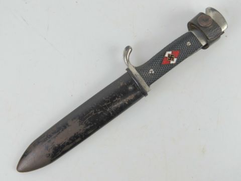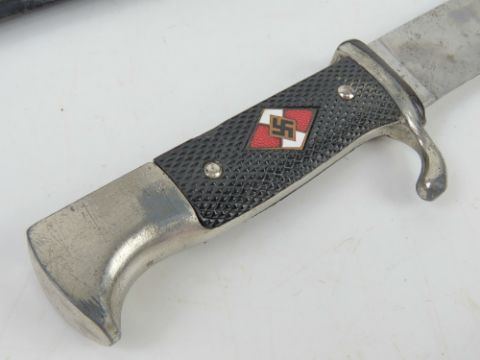 A WWII German Hitler Youth bayonet with scabbard. Blade measuring 14cm.
