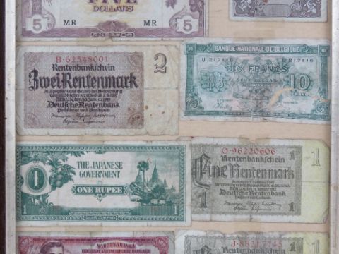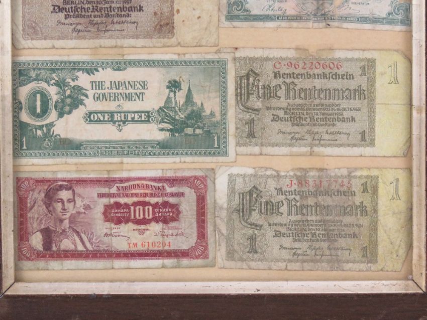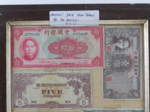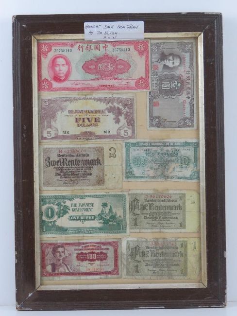 A framed montage of cWWII bank notes inc Chinese, Belgian, Japanese, German etc, with note stating the items were brought back from Japan by a British prisoner of war.