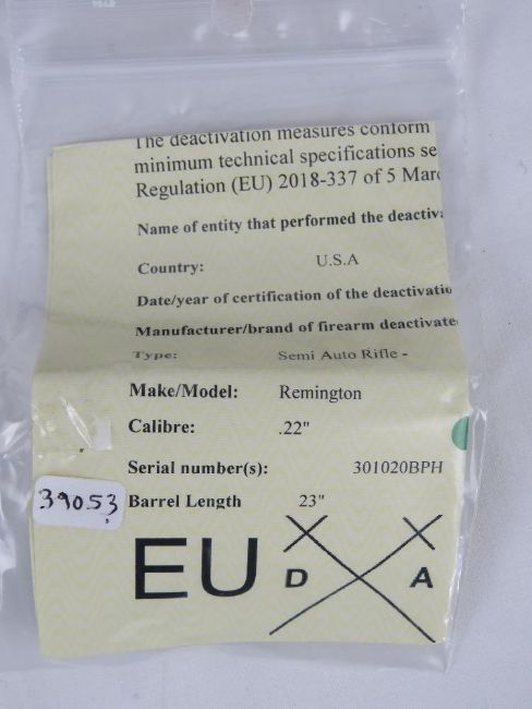 A deactivated Remington model 552 Speedmaster .22LR semi automatic rifle, moving cocking handle (under spring pressure), safety, and trigger, non firing action. ST-39053-SN-301020BPH. With EU certificate.